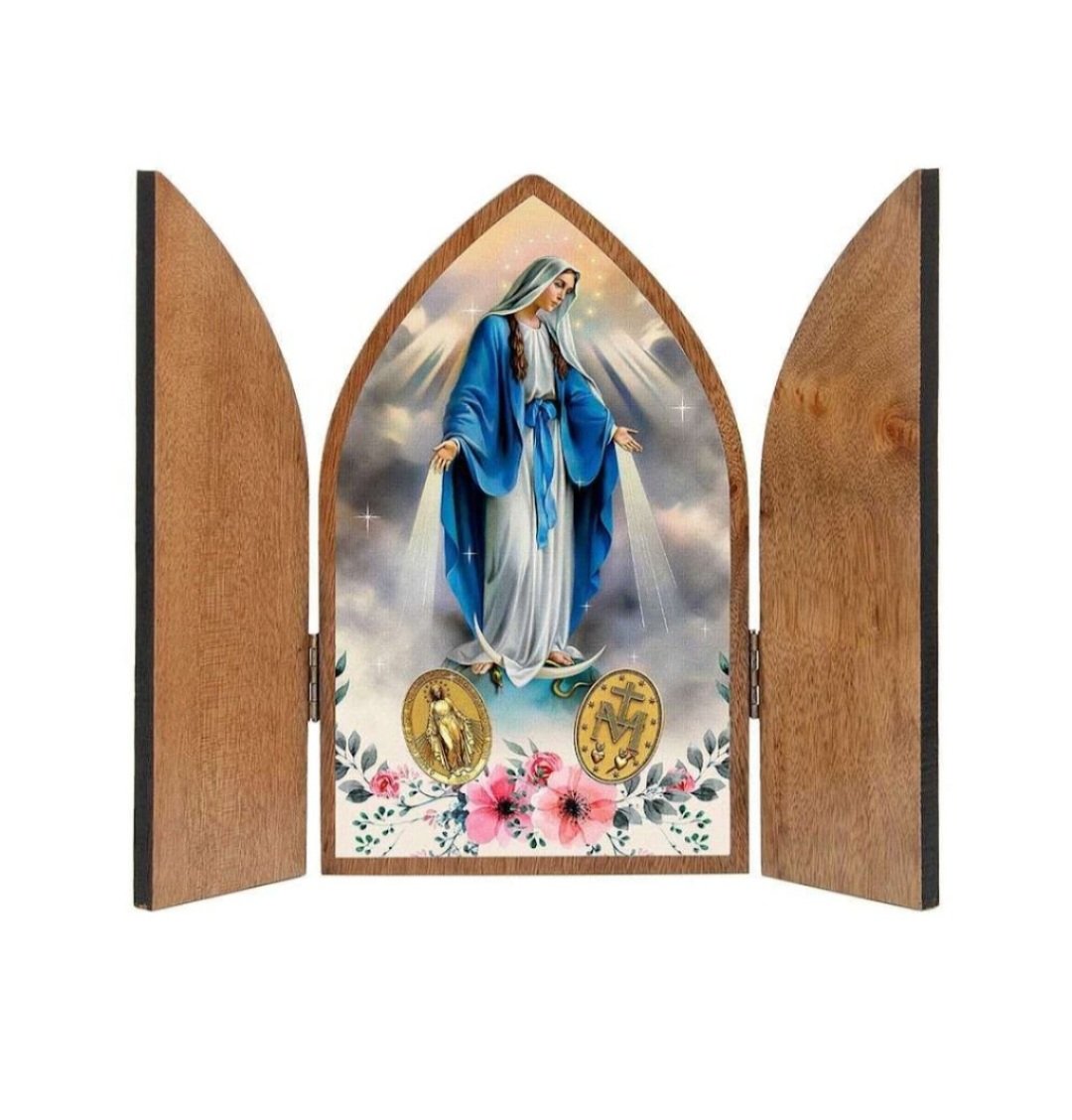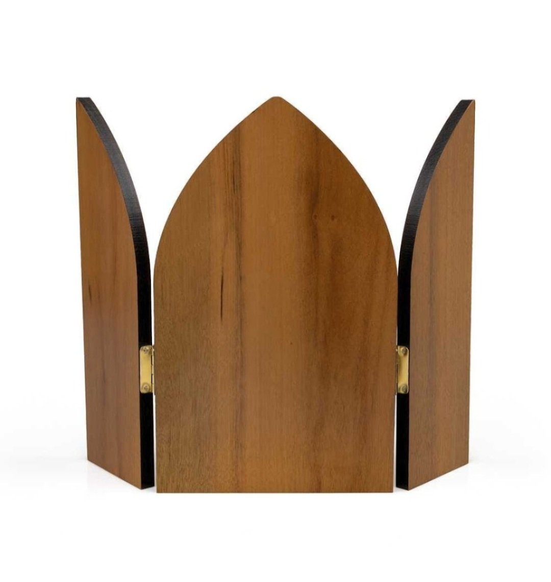 Detalhes do produto Capela feita em madeira com portas (abre e fecha). Imagem sobreposta com acabamento brilhante.