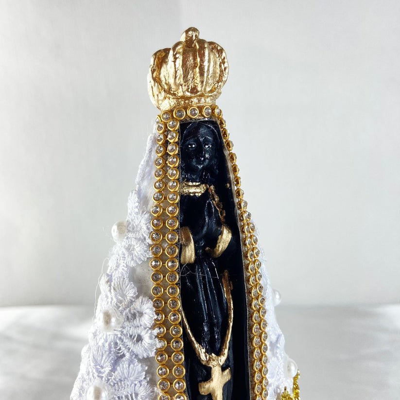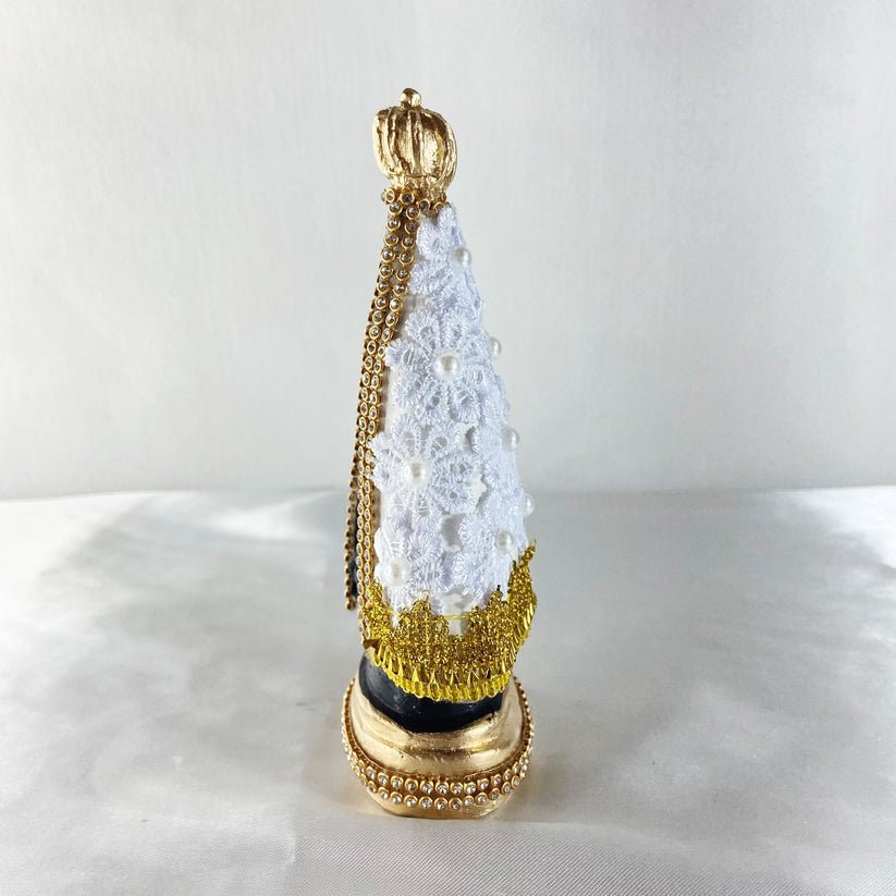 IMAGEM DE GESSO NOSSA SENHORA APARECIDA FLOR DE RENDA BRANCO COM STRASS 16CM