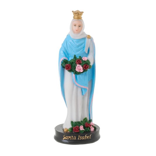 Ela é uma peça em resina, que confere maior resistência e durabilidade que o gesso. Sua pintura feita à mão, suas cores, traços e contornos bem definidos são detalhes que compõem a imagem dando a ela a forma de uma verdadeira obra de arte! Santa Isabel tem as vestes brancas com manto azul claro, na cabeça tem uma coroa, nas mãos e nos pés traz rosas.